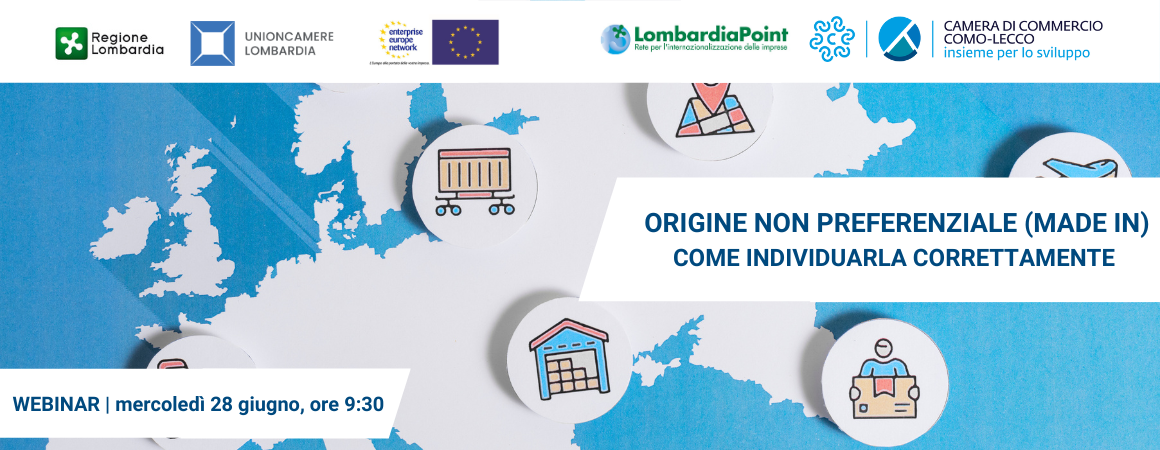 Il sistema camerale lombardo in collaborazione con la rete europea Enterprise Europe Network (EEN) organizza per il 28 giugno, dalle ore 9:30 alle ore 12:30, il webinar gratuito dal titolo "Origine non preferenziale (Made In): come individuarla correttamente”.