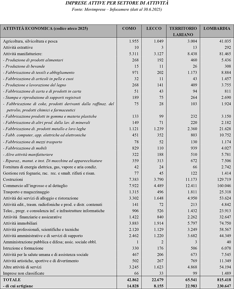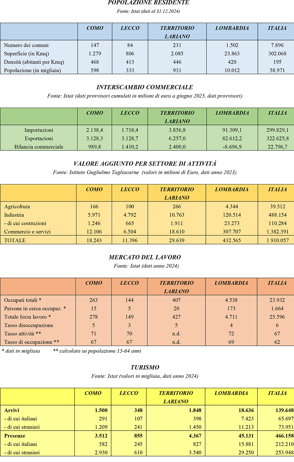 L’area vasta lariana costituita dalle province di Como e di Lecco si caratterizza per settori e vocazioni economiche diverse e complementari. Como vanta una solida tradizione e specializzazione turistica, un antico distretto tessile serico orientato all’abbigliamento tuttora protagonista; la zona del canturino si caratterizza per la presenza di un distretto del mobile e del design che, esportando i propri prodotti in tutto il mondo, tiene alto il “made in Italy” sui mercati internazionali. Lecco esprime una forte concentrazione di imprese metalmeccaniche con una filiera integrata, saldamente interconnessa e con ottime performance sui mercati mondiali: aziende subfornitrici di marchi prestigiosi e medie imprese leader in specifiche nicchie di mercato. Nella Brianza lecchese č presente un distretto del tessile per arredo fortemente vocato all’export.